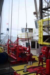 Drill crew collecting sub-seafloor sediment cores off the coast of Svalbard aboard the Joides Resolution. PC: Khyber Jones, JRSO Outreach Specialist.